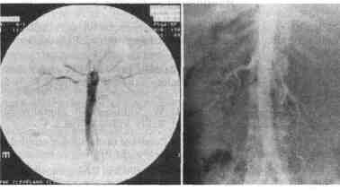• Выявление опухолевого тромба (почечно-клеточный рак). • Окончательное подтверждение тромбоза почечной вены • Определение содержания ренина в крови почечной вены при реноваскулярной гипертензии ![]() Рис. 4-1. Слева Цифровая субтракционная ангиограмма, на которой определяется билатеральный стеноз почечных артерий Справа Стандартная катетеризационная ангиограмма на которой определяется смещение левой почечной артерии вниз за счет расположенного слева большого гиповаскулярного объемного образования надпочечника 19. Назовите три ангиографические методики.