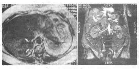 ![]() Рис. 7-1. Слева. Период Т2 МРИ. Определяется объемное поражение правого надпочечника изоинтенсивное по сравнению с печенью, т. е. аденома. Справа. Градиентное эхо-изображени« живота. Определяется протяженный тромб полой вены, исходящий из злокачественной опухсш правой почки 9. Можно ли с помощью МРИ провести дифференциальную диагностику опухоли